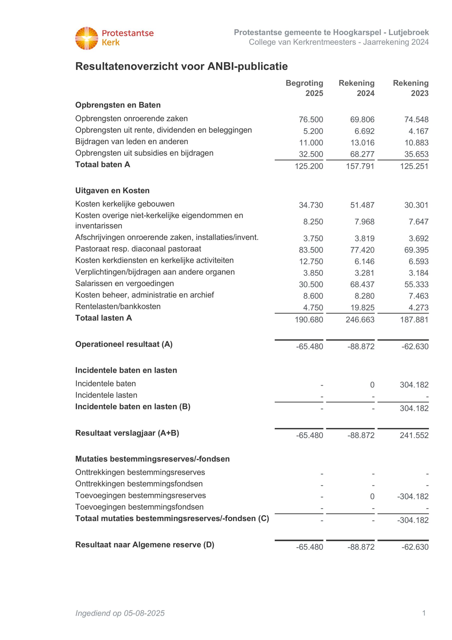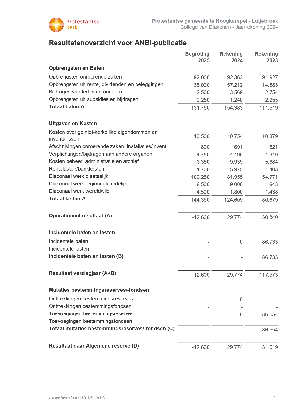 De Protestantse Kerk heeft van de Belastingdienst een groepsbeschikking ANBI gekregen. Dat wil zeggen dat de afzonderlijke gemeenten en andere instellingen die tot dit kerkgenootschap behoren zijn aangewezen als ANBI. Dit is ook van toepassing op de Protestantse gemeente te Hoogkarspel – Lutjebroek.